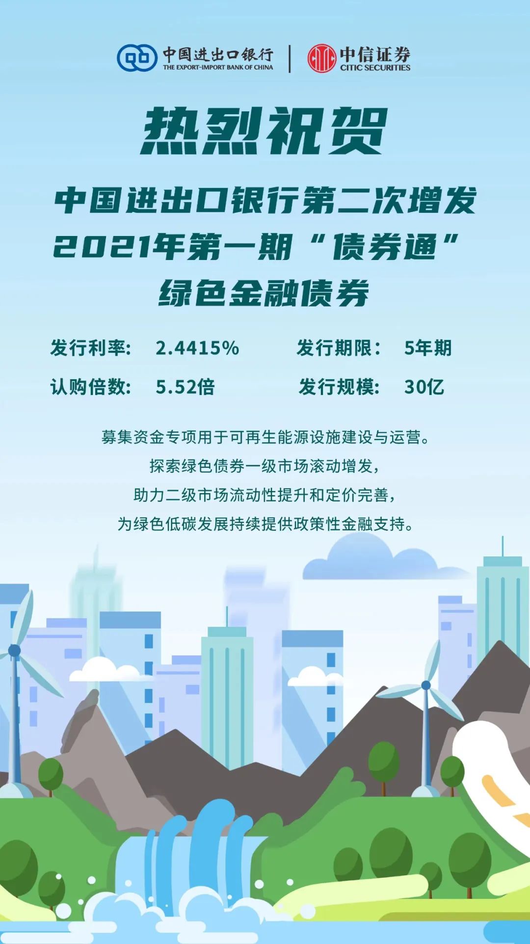 4月28日,中国进出口银行在全国银行间债券市场第二次增发2021年第一期“债券通”绿色金融债券,期限5年,发行利率2.4415%,投标倍数5.52倍,发行规模30亿元,募集资金专项用于可再生能源设施建设与运营。中信证券担任主承销商。