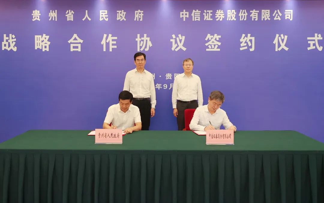 9月1日,中信证券党委书记、董事长张佑君一行拜访贵州省委副书记、省长李炳军,并共同出席《贵州省人民政府中信证券股份有限公司战略合作协议》签约仪式。贵州省副省长、省政协副主席李再勇,中信证券党委副书记、监事会主席张长义代表双方签约。