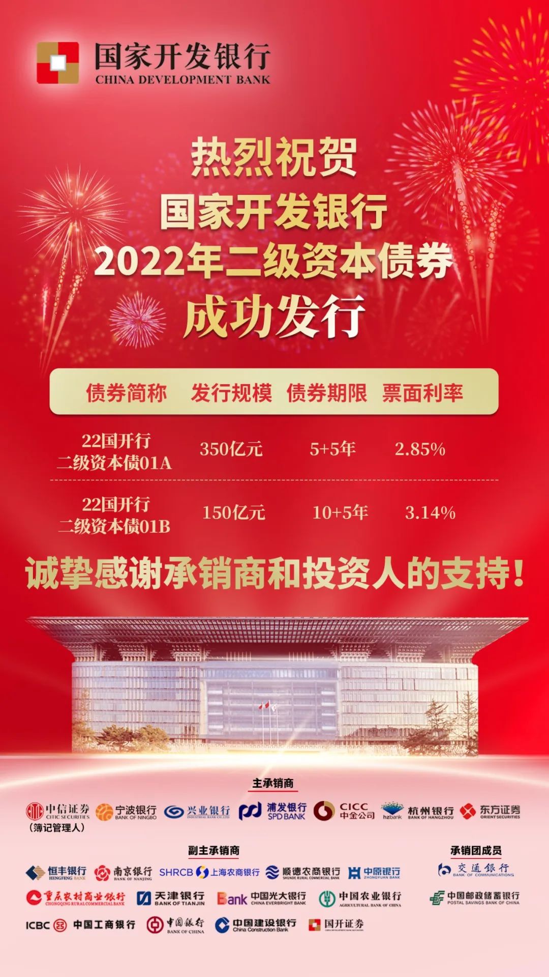 11月2日,国家开发银行2022年二级资本债券在全国银行间市场成功发行,发行规模500亿元。本次发行启动双向回拨机制,5+5年期品种、10+5年期品种最终发行规模分别为350亿元、150亿元,发行利率分别为2.85%、3.14%,获得市场热烈反响。中信证券担任本次发行主承销商、簿记管理人,承销表现优秀。