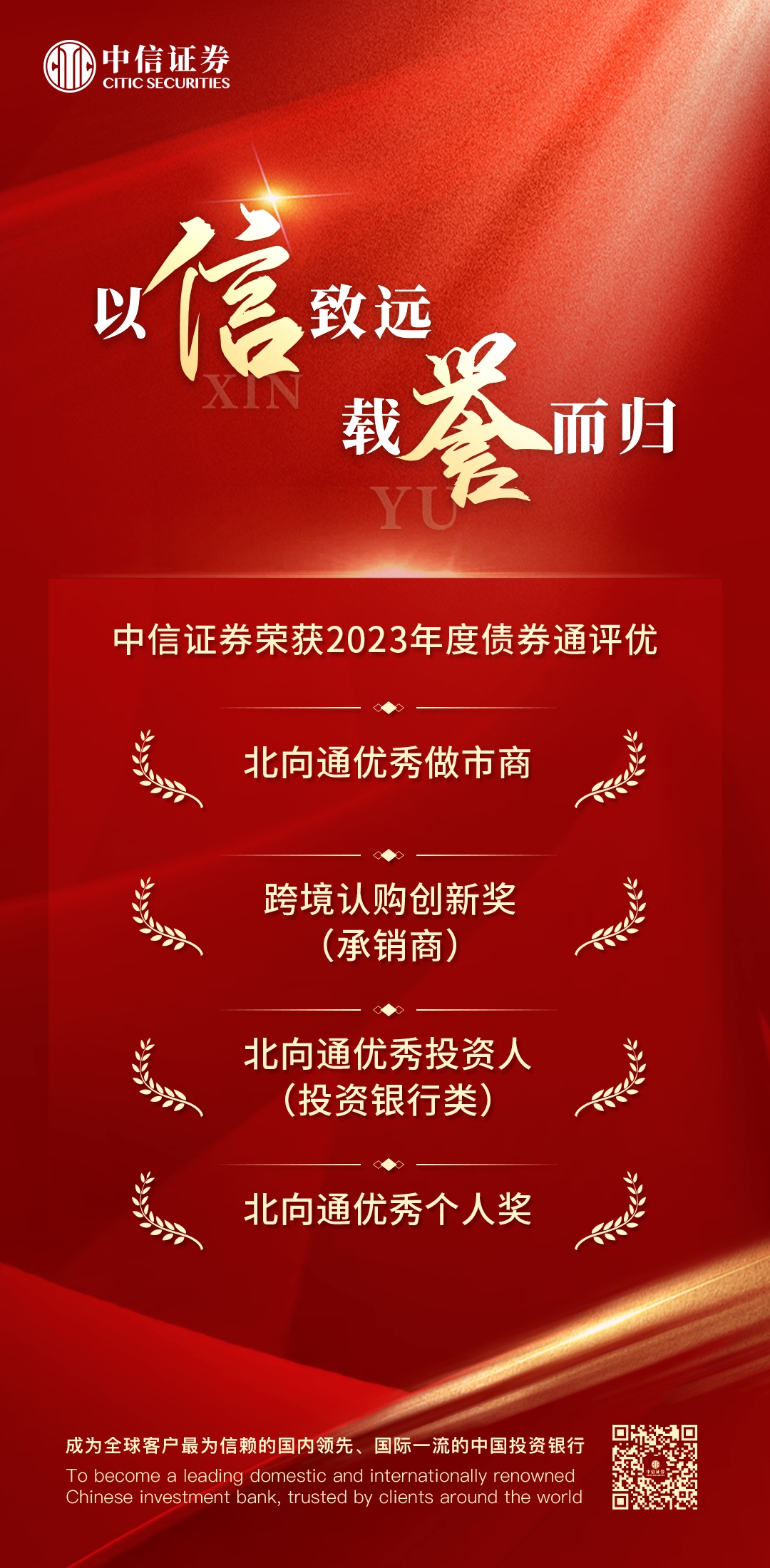 近日,债券通公司发布2023年度债券通参与机构评优结果。中信证券与中信里昂证券共获得三项优秀机构奖项和三项优秀个人奖项。