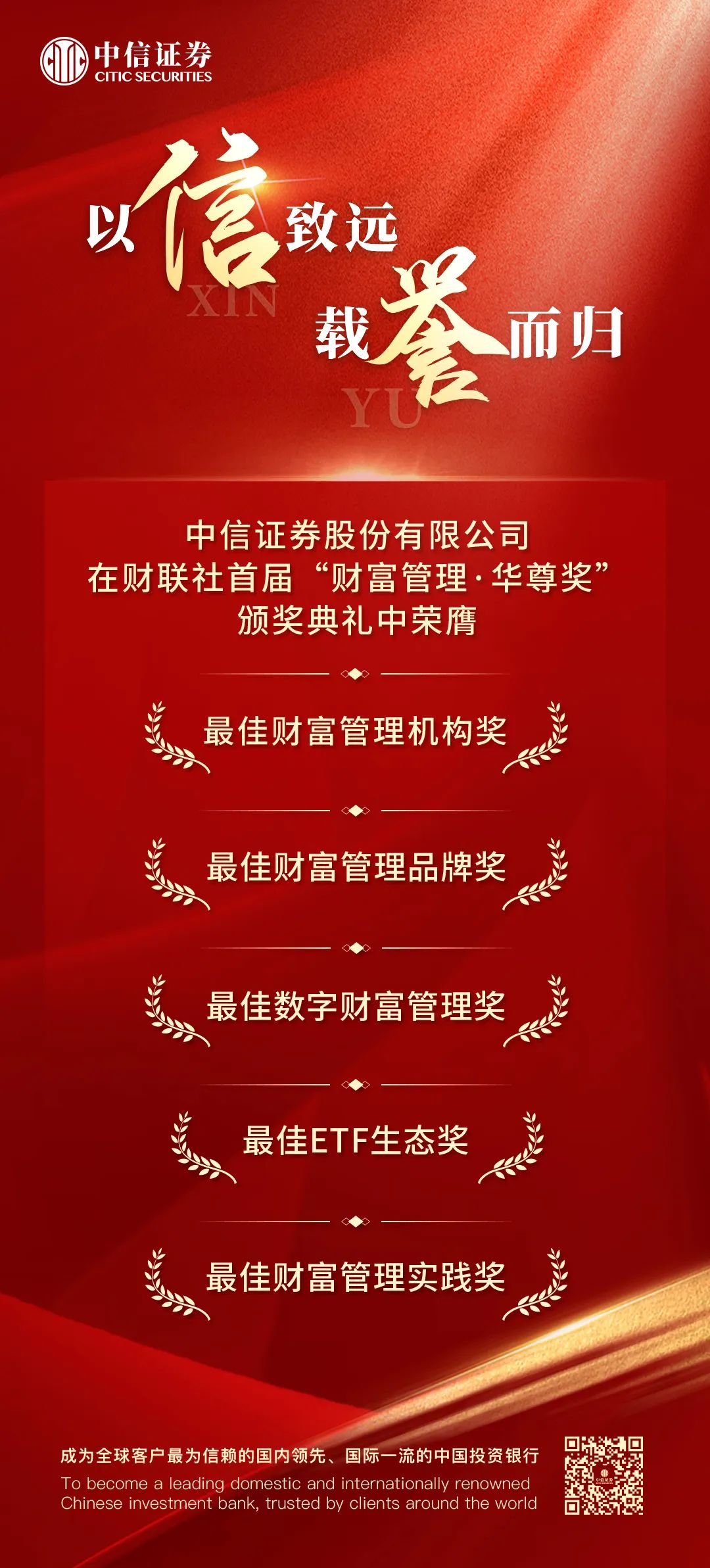 此次获奖,反映了中信证券在财富管理业务领域所取得的成绩和行业认可。中信证券将继续从客户需求出发,以丰富的经验和专业的精神,为广大合格投资者提供更优质的产品和服务。