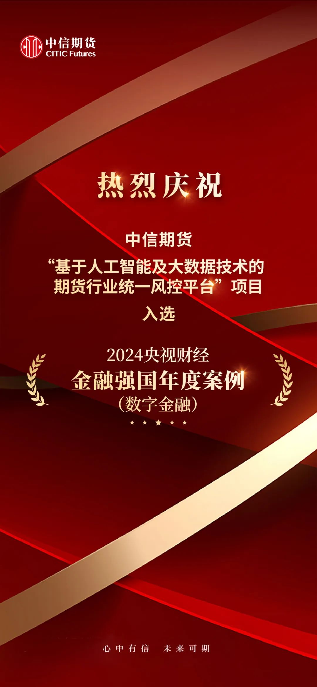 近日,中央广播电视总台“2024央视财经金融强国年度盛典”在北京成功举办。活动现场发布“2024央视财经金融强国年度案例”,集中展示金融服务实体经济、服务高质量发展的创新实践。中信证券子公司中信期货的“基于人工智能及大数据技术的期货行业统一风控平台”作为行业唯一案例入选“数字金融”年度案例。