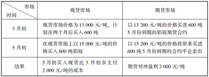 由此可见,该铝型厂在2个月后买入铝锭比3月初买入少支付了500元/吨,但由于在期货市场上做了买入保值,期货市场亏损了500元/吨,因此,该铝型材厂铝锭的实际进价成本仍然为13000元/吨,即用现货市场上少支付的500元/吨弥补了期货市场上亏损的500元/吨。