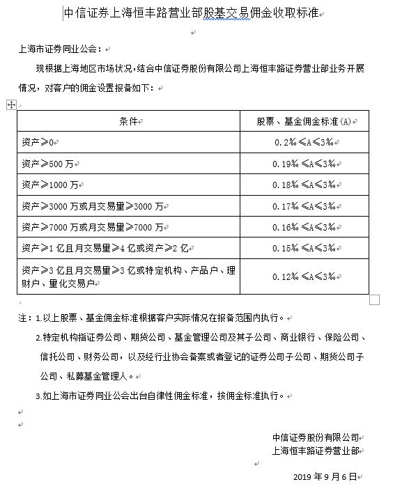 中信证券上海恒丰路营业部股基交易佣金收取标准
